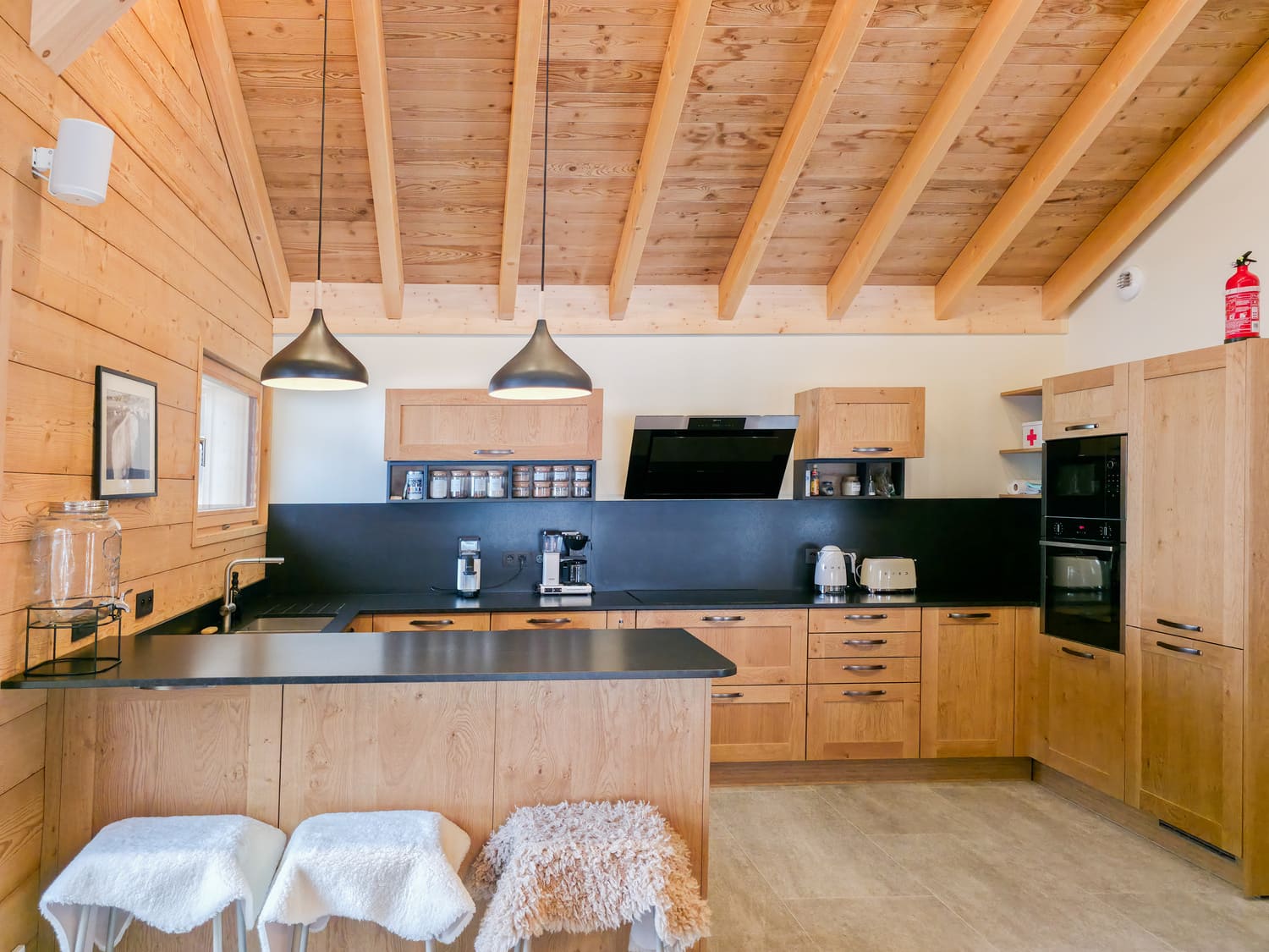 Combining relaxation and practicality, the chalet is also perfectly suited for stays that blend leisure and remote work. Each bedroom includes a small desk for occasional use, while the master suite features a fully equipped office with screen and printer.