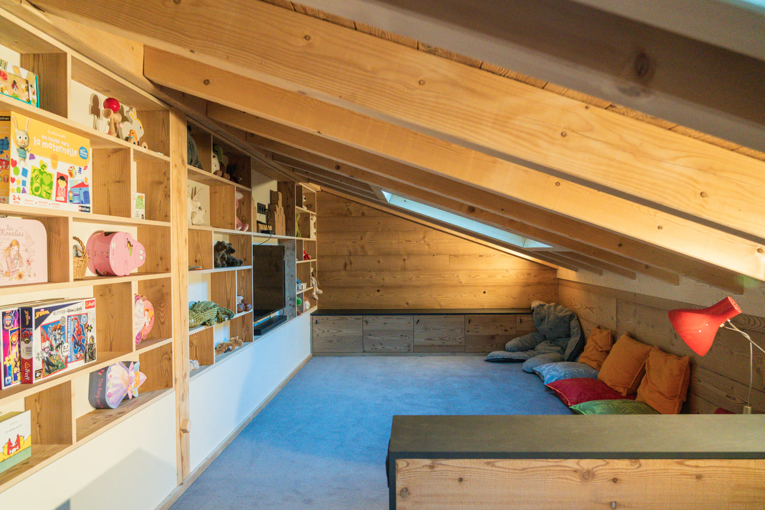This chalet rental in Saint-Gervais offers dedicated spaces for everyone. Under the eaves, a spacious games room with TV creates a cozy retreat for children, complete with games, books, and comfortable seating.